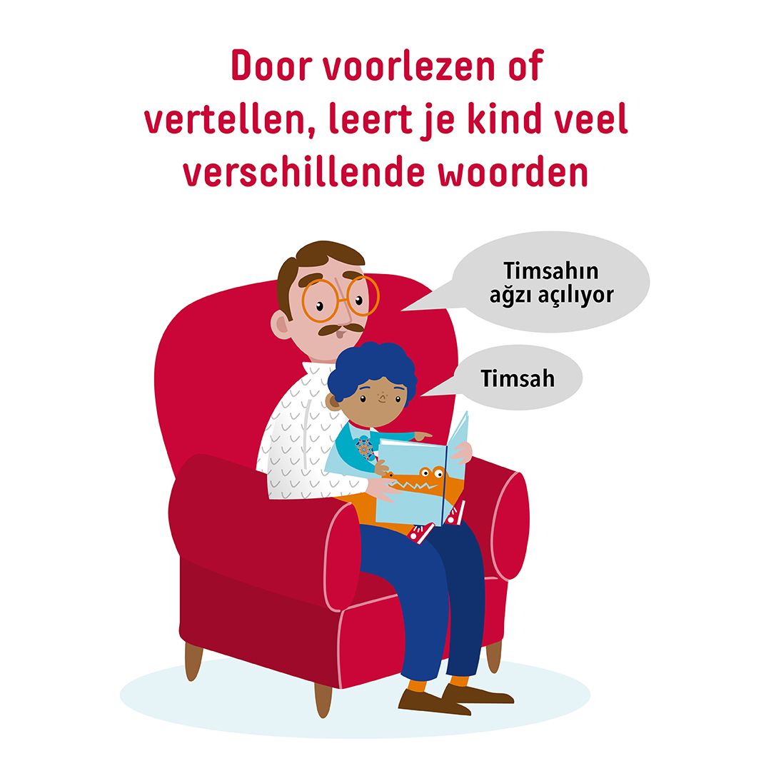 Om taal goed te kunnen leren, moeten kinderen veel verschillende woorden horen. Voorlezen of vertellen doe je in je beste taal. Je kunt ook samen naar digitale prentenboeken luisteren.